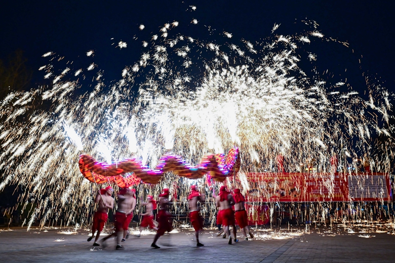 民间艺人在河南省洛阳市2024隋唐河洛文化庙会上表演打铁花(2024年2月14日摄)。新华社发(李卫超 摄)